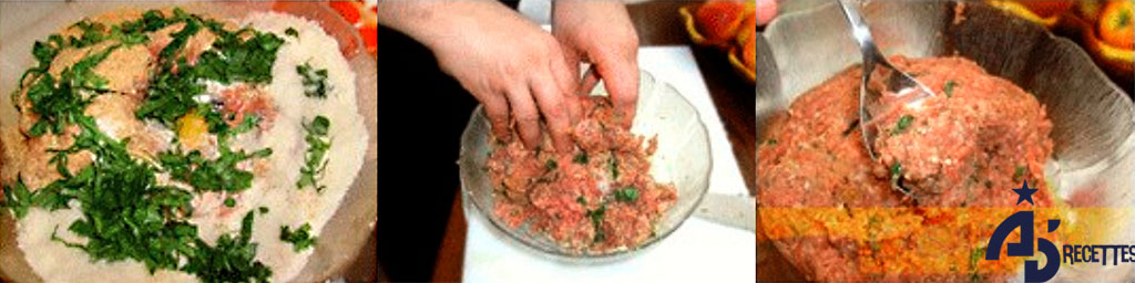 Prélevez une cuillère bombée de farce, compactez-la légèrement de la main gauche (ou la main opposée à celle dont vous vous servez avec la cuillère) puis roulez-la entre vos paumes jusqu’à obtenir la forme de boule. Aplatissez-la légèrement (cela facilitera la répartition de la chaleur à la cuisson et évitera un cœur cru) réservez au fur et à mesure dans un plat jusqu’à utilisation de toute la farce.