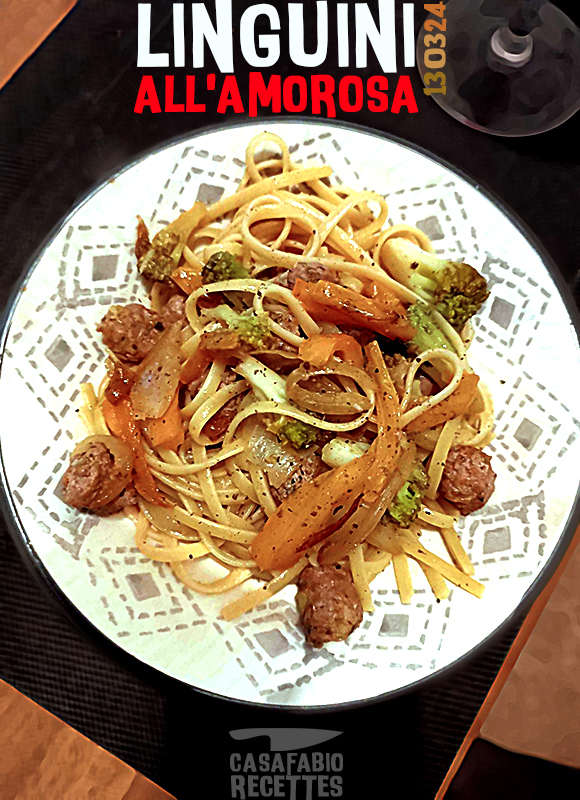 Quand on improvise à deux, sur des bases classiques certes, avec le contenu du réfrigérateur et du placard… Cela peut aboutir à un excellent plat de pasta à déguster tel la Belle et le Clochard, devant une très bonne série…