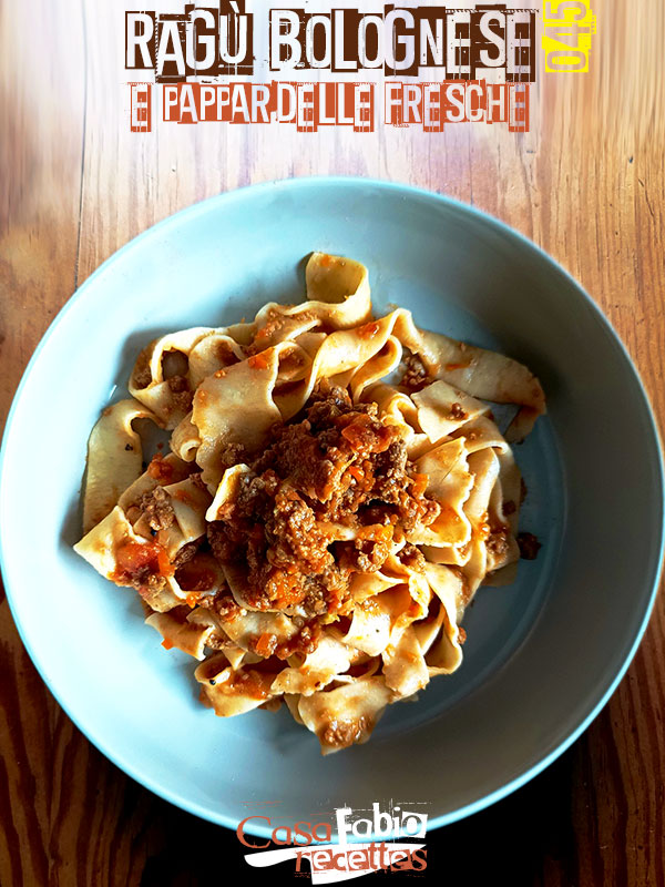 Je préciserai simplement, mais c’est important, qu’on parle de ragù, du français ragoût oui, et donc de viande mijotée et non de sauce tomates à la viande. Cette différence justifie du coup l’utilisation de tagliatelles ou d’autres types de pâtes longues et plates (ici quelques pappardelles réalisées par mes soins… plus à même d’accrocher le ragoût donc.