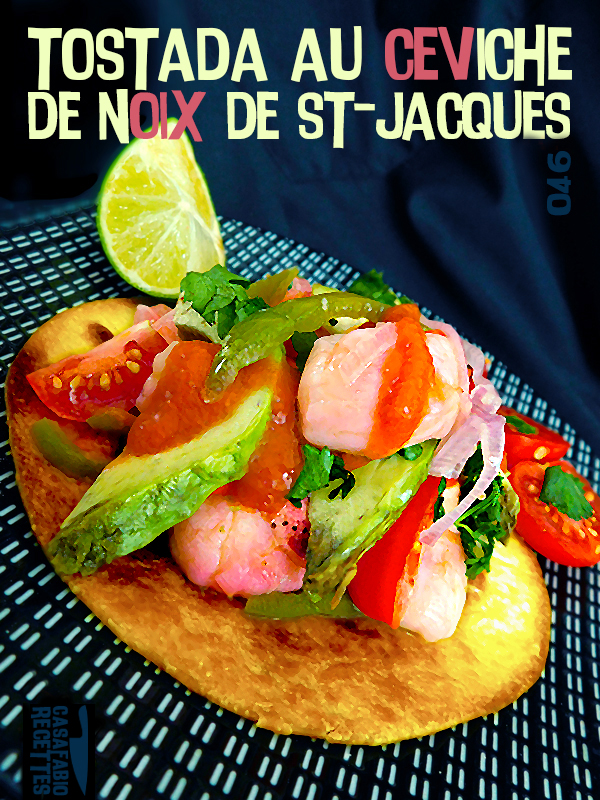 Les tostadas, littéralement toasts, sont de petites tortillas de mais Mexicaines, d’une quinzaine de centimètres de diamètre, poêlées, généralement avec du saindoux avant d’être garnies. Particulièrement sur les côtes on en trouve de nombreuses variantes à base de poissons, fruits de mer et légumes ultra frais, sans oublier l’infini choix de sauces plus ou moins épicées ou piquantes qui servent à les condimenter. Je vous en propose une version ceviche (poisson cuit à froid au jus de citron vert) que j’affectionne particulièrement et que je fais le plus souvent avec du saumon, avec ou sans tortilla d’ailleurs, mais dans ce cas les chips de maïs sont obligatoires… Donc direction Veracruz, ville où le ceviche de Saint-Jacques est la spécialité…