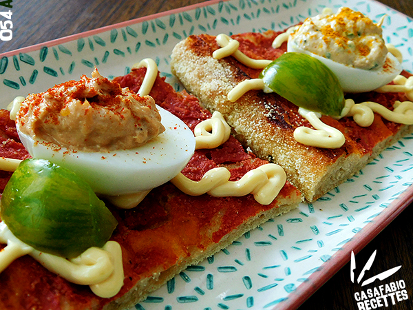 Farce 1 (gauche de l’image) ; 1/2 petite boîte de thon, le jaune de la moitié des œufs durs, 3 c.à.s. de mayonnaise, 2 c.à.c. de harissa, pimentòn