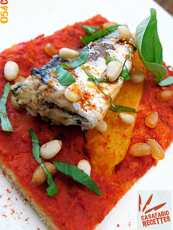 Pizza « Pincho » – Avec sardines à l’huile d’olive, poivron jaune rôti et épluché, pignons de pin toastés à sec, basilic frais et pimentòn