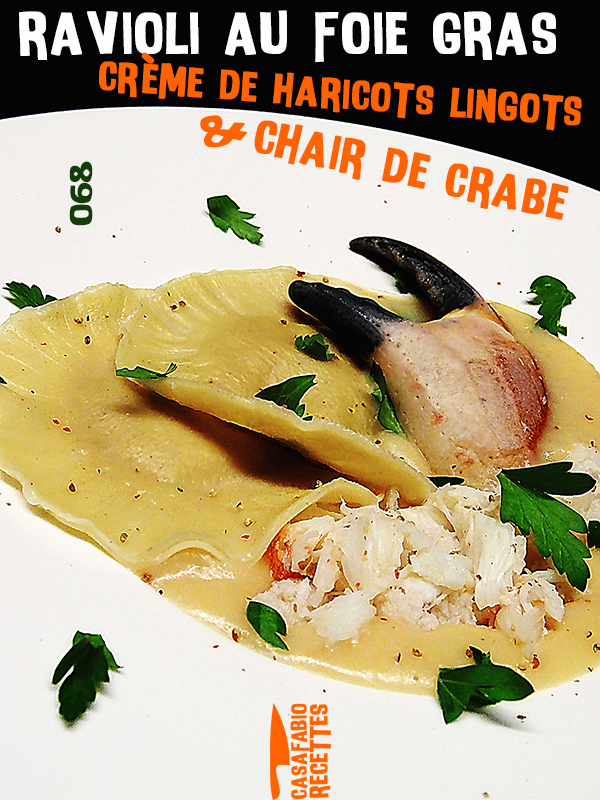 Une recette élaborée à partir d’un article, lu il y a quelques années, relatant le résultat d’un concours gastronomique international. Bien que n’ayant aucune indication sur les ingrédients, l’intitulé du plat vainqueur m’avait assez motivé pour m’en inspirer. Et oui, les raviolis au foie gras, le crabe et la texture du velouté de haricots blancs, ça marche très bien ensemble…