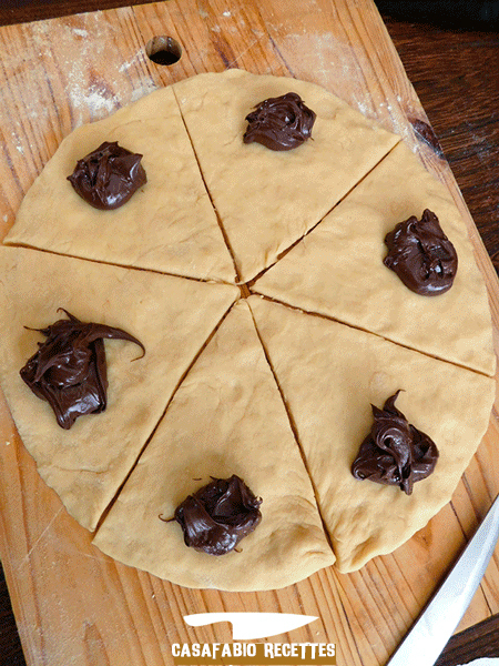 - Coupez le disque en 6 à 8 triangles égaux. Déposez une cuillère à café bombée de pâte à tartiner su la base large du triangle, en laissant 3 bons centimètres pour rabattre. Enroulez la pâte sur elle-même jusqu’à la pointe pour leur donner une forme de croissant.