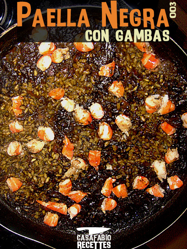 Versez le riz en pluie. répartissez le ni touchez plus. Laissez cuire à feu vif 5mn. - Réduisez le feu au minimum. Poursuivez la cuisson 13 à 15mn selon la qualité du riz. 2mn avant la fin de cuisson, ajoutez délicatement la moitié des gambas préalablement coupées en morceaux. Hors du feu, couvrez avec un torchon propre (je préfère du papier absorbant ds le cas de l’encre…) et d’un couvercle. Laissez reposer et finir de cuire 10mn avant de servir. Poêlez rapidement le restant de gambas pour les réchauffer. Répartissez les sur le riz dans les assiettes. Arrosez d’un filet de jus de citron si désiré pour déguster.