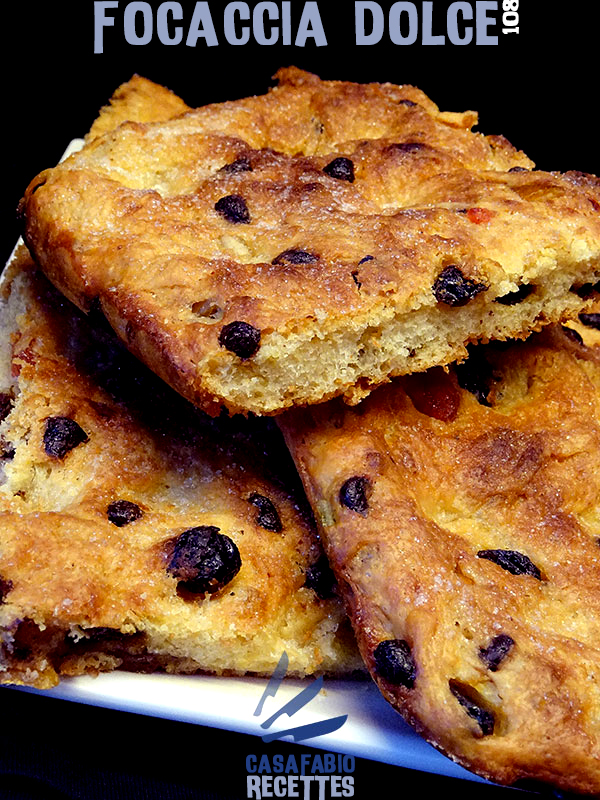 Une version sucrée de la focaccia, que j’ai voulu rendre un peu plus festive en l’additionnant de raisins secs et de pépites de chocolat, soyons fous…