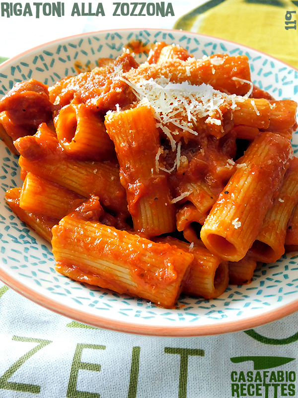 Si la carbonara, comme vous le savez (…) est une invention « récente » (fin de la seconde guerre mondiale) due selon la légende à un restaurateur Romain zélé voulant satisfaire les goûts des « libérateurs » Anglo-Saxons en mélangeant les recettes de pâtes de la gricia (guanciale et fromage), du cacio e pepe (fromage et poivre) et du cacio e uova (fromage et oeuf), la Zozzona et son nom rigolo qui signifie littéralement « n »importe quoi », va plus loin en y ajoutant l’Amatriciana (guanciale et tomates). Et ça sera tout? Non, bien sûr… la cerise sur le gâteau étant l’addition de la Norcina (une saucisse locale) qu’on remplacera ici par une bonne saucisse au couteau ou de Toulouse par commodité… Andiamoci (on y va!) Rigatoni alla zozzona