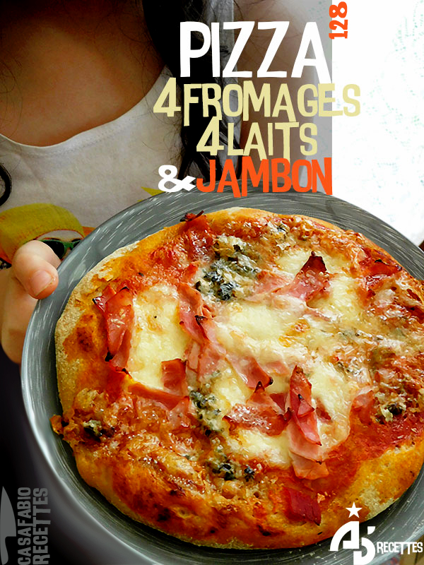 Une version de la classique pizza 4 fromages, où j’ai choisi d’utiliser des produits issus de 4 animaux différents. Selon vos goûts vous pourrez évidemment opter les fromages de votre choix. Ici le jambon et totalement facultatif. On peut également se passer de tomates et ajouter un peu plus de fromage… Pour cette recette qui est une des favorites de ma fille, celle-ci m’a donné un coup de main à sa réalisation. Merci ma chérie. One love!