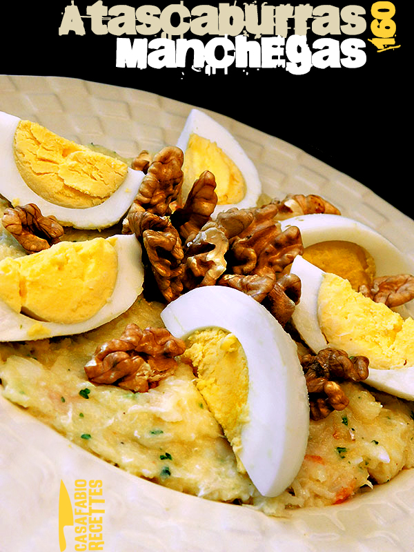 - Servez en surmontant l’atascaburras, avec des quarts d’œufs durs et de cerneaux de noix. On pourra saupoudrez d’encore un peu de pimentòn et saler très légèrement les œufs.