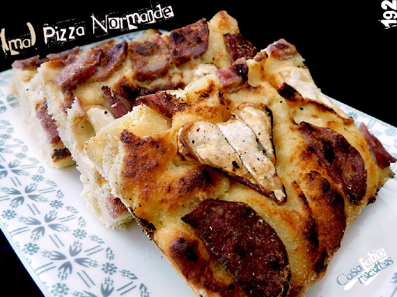 En bon Sicilo-Espagnol, j’aime cuisiner aussi avec des produits locaux… Honneur donc aujourd’hui à ma région de naissance, la Normandie, avec cette pizza toute personnelle garnie de 2 des produits phares du cru, la crème bien sûr et le Neufchâtel, un fromage au lait de vache, souvent en forme de cœur qui mérite d’être plus connu… Le saucisson à l’ail utilisé pour l’occasion est également une production artisanale des environs de Rouen.