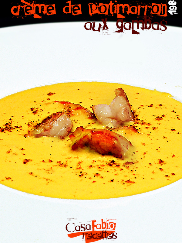 Un classique velouté de potimarron, agrémenté ici d’une touche Ibérique avec des épices typiques de cette gastronomie, le safran bien sûr et l’incontournable pimentòn, ainsi que quelques gambas snackées.