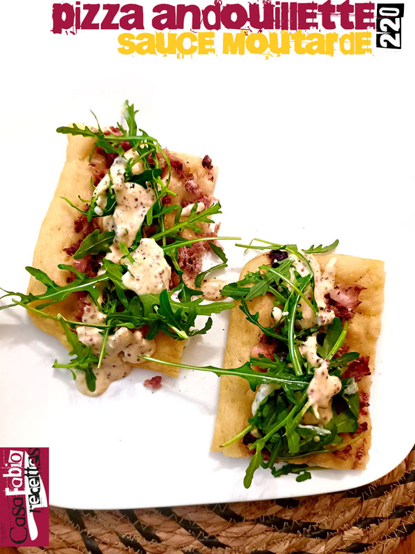 Adaptation d’un de mes (nombreux) péchés mignons à griller au barbecue, cette pizza garnie d’andouillette passée par le four brûlant n’a plus besoin que d’un simple nappage de crème à la moutarde et d’une poignée de feuilles de roquette (ou d’une autre salade de votre choix)